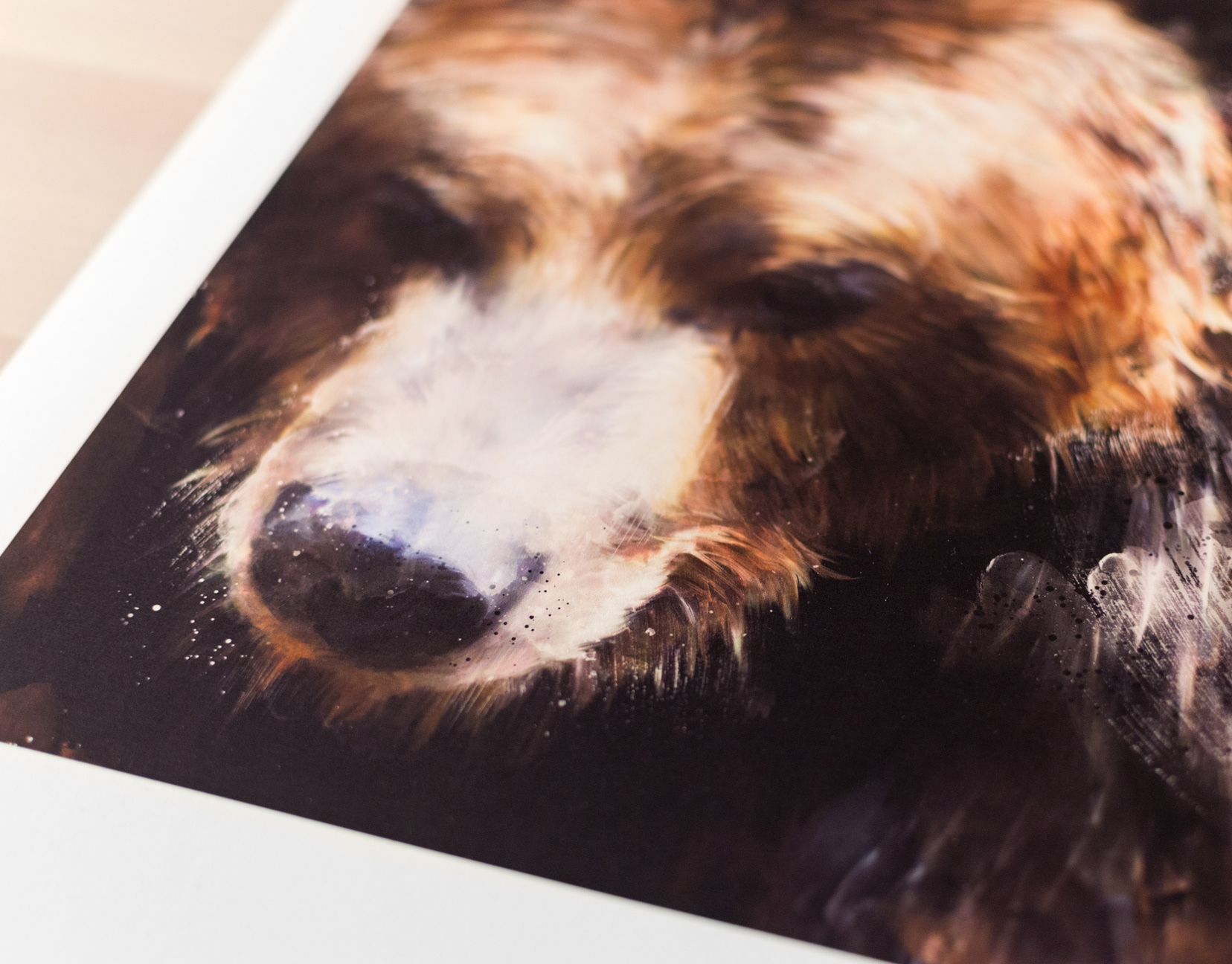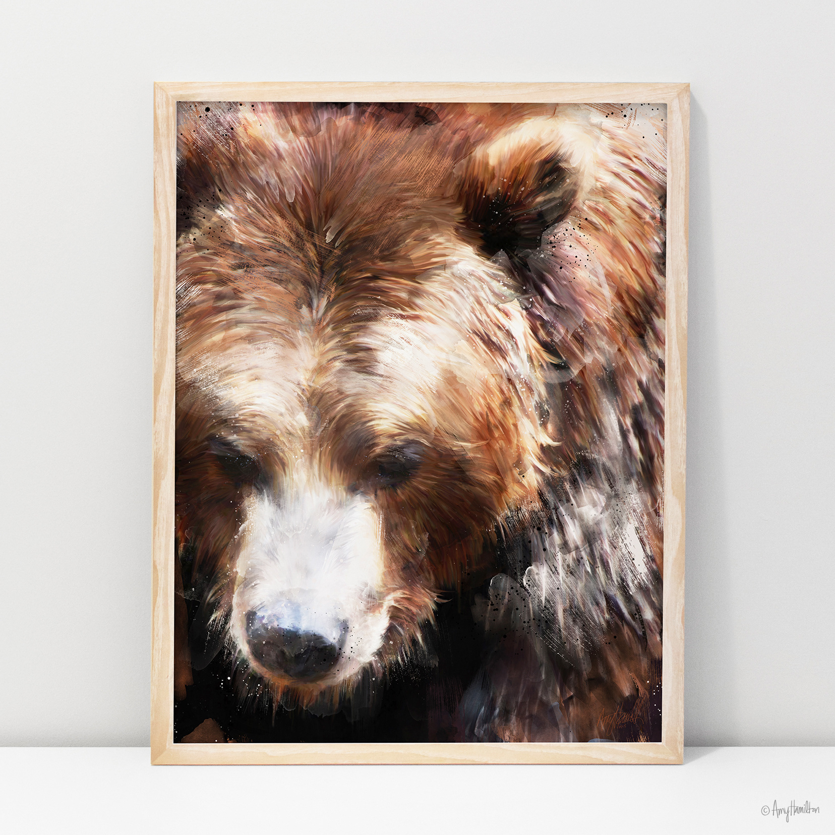 A brown bear illustration created using a combination of analog and digital drawing. Layers upon layers of ink, watercolour, and acrylic textures give it depth and interest.