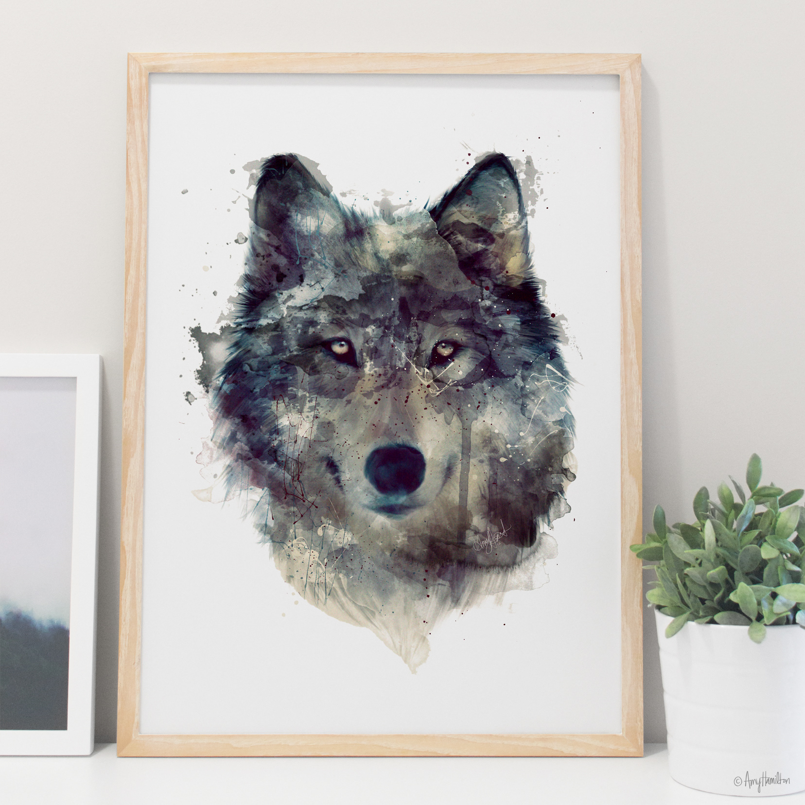 Heavy layers of solid colour provide details and loose splatters of deep blue draw attention to the intense gaze of a grey wolf.